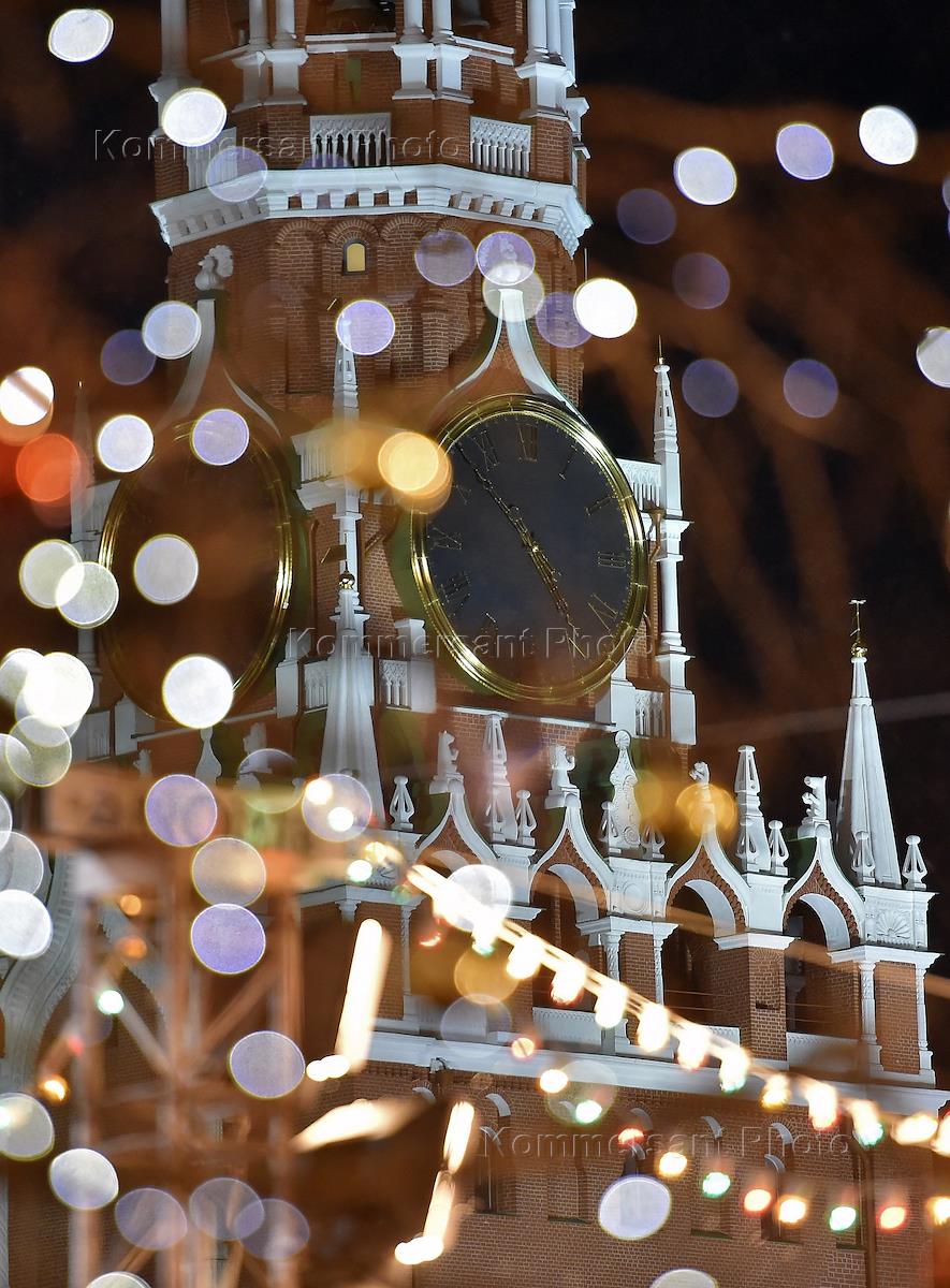 Виды Москвы. Новогоднее убранство города. Спасская башня Московского Кремля.