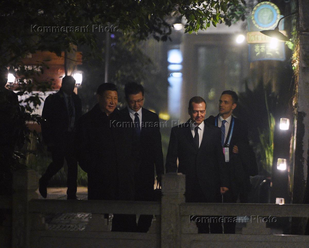 Председатель правительства России Дмитрий Медведев (слева) и председатель Китайской Народной…