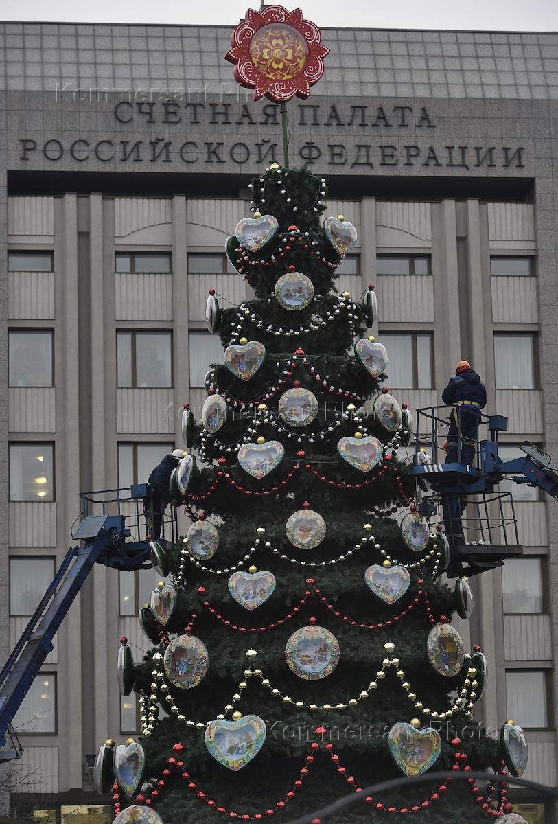 Жанровая фотография. Рабочие во время оформления новогодней елки у здания Счетной палаты России.