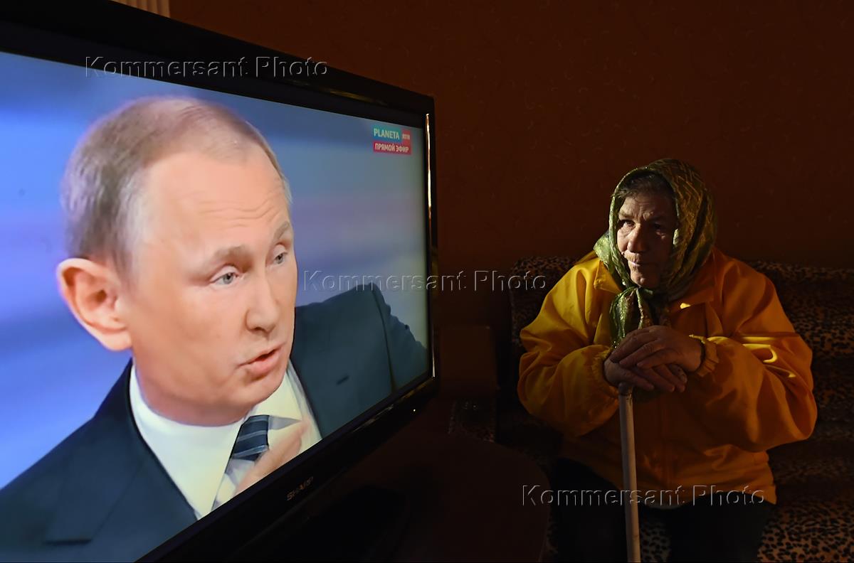 Пенсионерка слушает пресс-конференцию президента России Владимира Путина