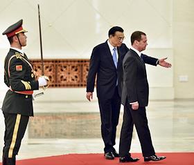 Председатель правительства России Дмитрий Медведев (слева) и премьер Государственного совета КНР Ли…