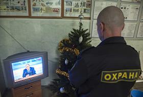 Трансляция ежегодной пресс-конференции президента России Владимира Путина. Телевизор в вестибюле…