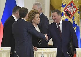 Слева направо: председатель Государственной думы России Сергей Нарышкин, председатель Совета…
