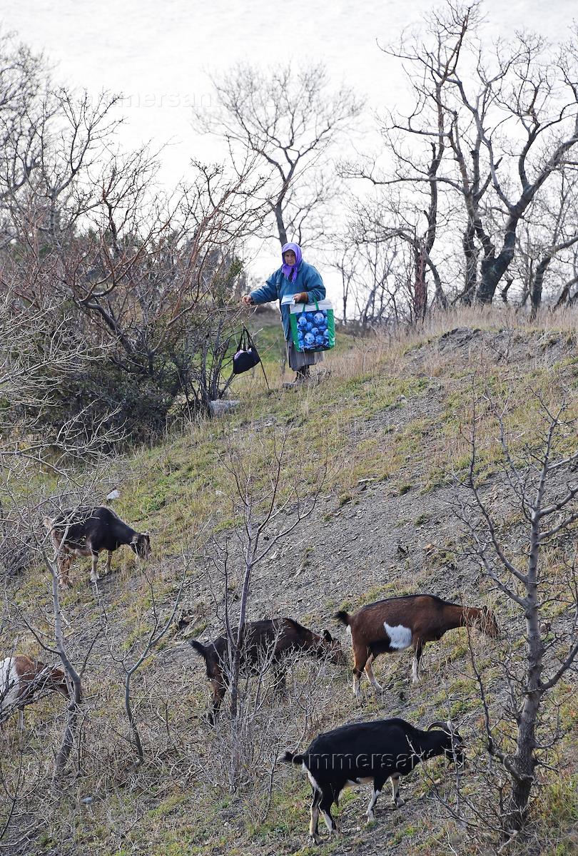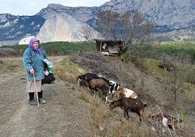 Жанровая фотография. Пожилая женщина пасет коз на склоне горы.