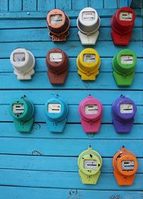 Жанровая фотография. Разноцветные электрические счетчики на стене дачного дома в деревне Васкелово.