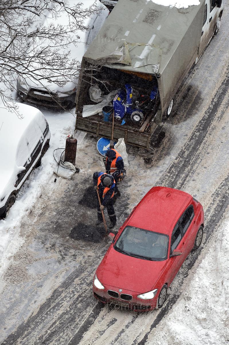 Жанровая фотография. Снегопад в Москве. Сотрудники службы ремонта дорог во время укладки асфальта.