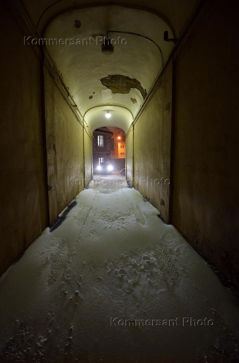 Жанровая фотография. Снегопад в Москве. Арка в жилом дом в центре города.