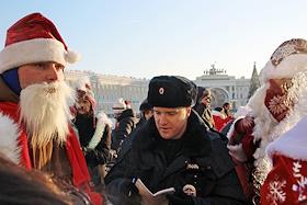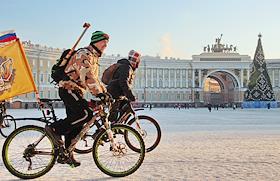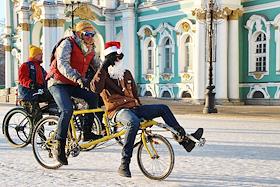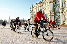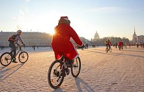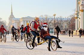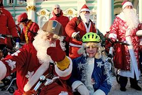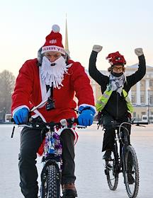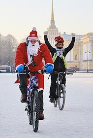 Велопарад Дедов Морозов и Снегурочек. Участники велопарад на Дворцовой площади.