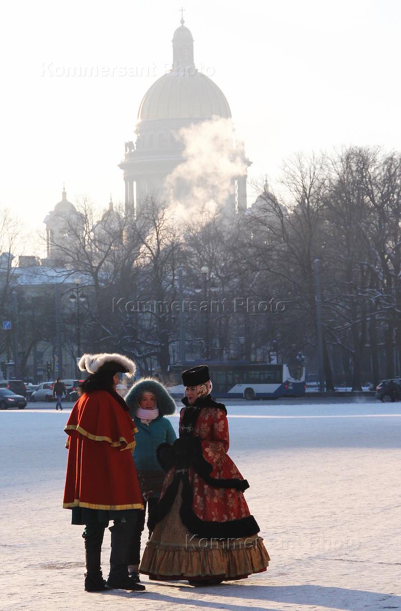 Виды Санкт-Петербурга. Артисты в косюмах царя и царицы на Дворцовой площади.
