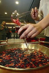 Летняя площадка кафе "МанерЪ". Официант разливает напиток в бокалы.