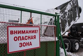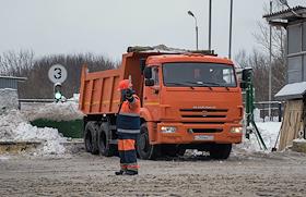 Снегосплавный пункт "Черкизово". Большегрузовые автомобили во время выгрузки снега. Вывеска с…