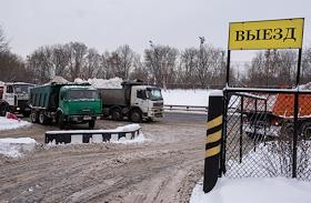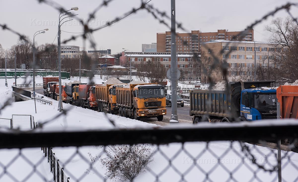 Снегосплавный пункт "Черкизово". Очередь большегрузовых автомобилей перед выгрузкой снега.