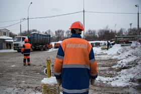 Снегосплавный пункт "Черкизово". Надпись на спине куртки сотрудника пункта "Мосводоканал".