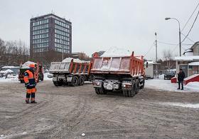 Снегосплавный пункт "Черкизово". Большегрузовые автомобили перед выгрузкой снега.