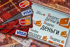 Жанровая фотография. Сервис "Яндекс Деньги". Кредитные карты и купюры достоинством пятьсот рублей.