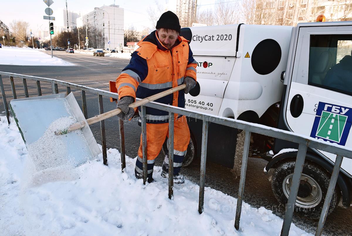 Жанровая фотография. Работник коммунальной службы города во время уборки снега и применения…
