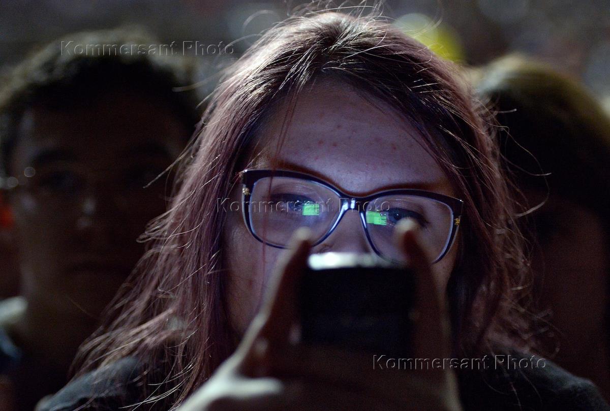 Концерт группы Imagine Dragons в СК "Олимпийский". Девушка с мобильным телефоном во время концерта.