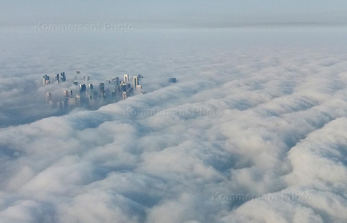 Жанровая фотография. Верхушки небоскребов через плотные облака и туман города Доха на побережье…