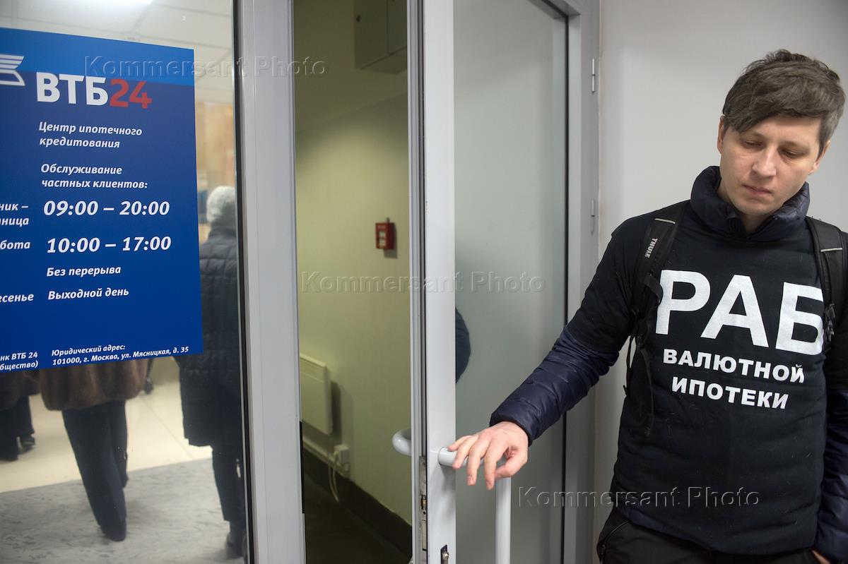Участники акции протеста валютных заемщиков в здании банка ВТБ24 с требованием пересмотреть условия…