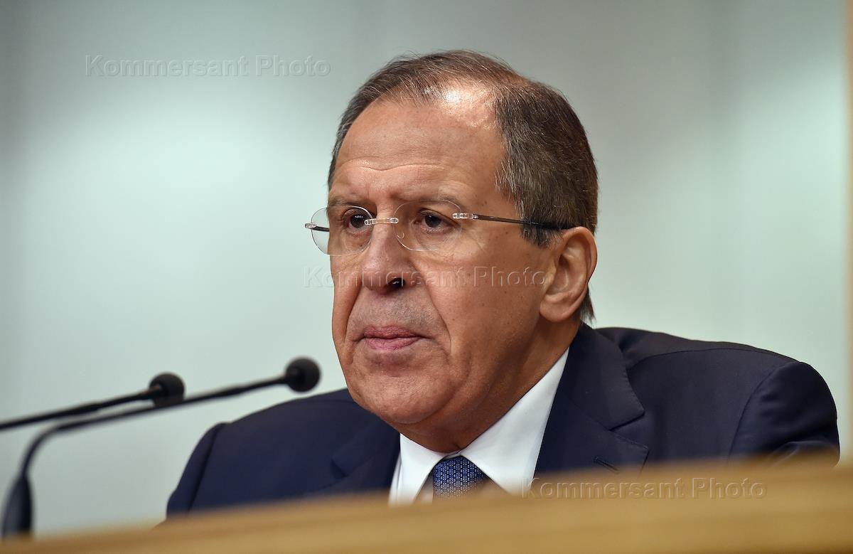 Министр иностранных дел России Сергей Лавров во время пресс-конференции в пресс-центре МИД России.