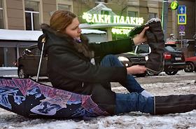Трактир "Елки-палки" на площади Тверской заставы. Девушка в медицинской маске, на земле в одном сапоге