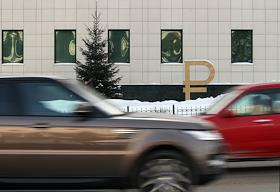 Скульптура в виде знака рубля на Октябрьской магистрали в Новосибирске.