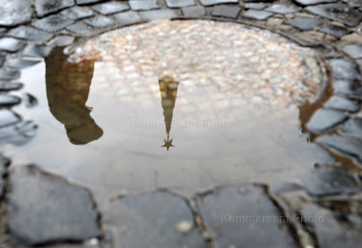 Жанровая фотография. Лужа на брусчатой мостовой, в которой отражается звезда на шпиле здания.