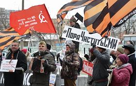 Активисты Национально-освободительного движения во время пикета перед зданием редакции РБК. Баннер с…