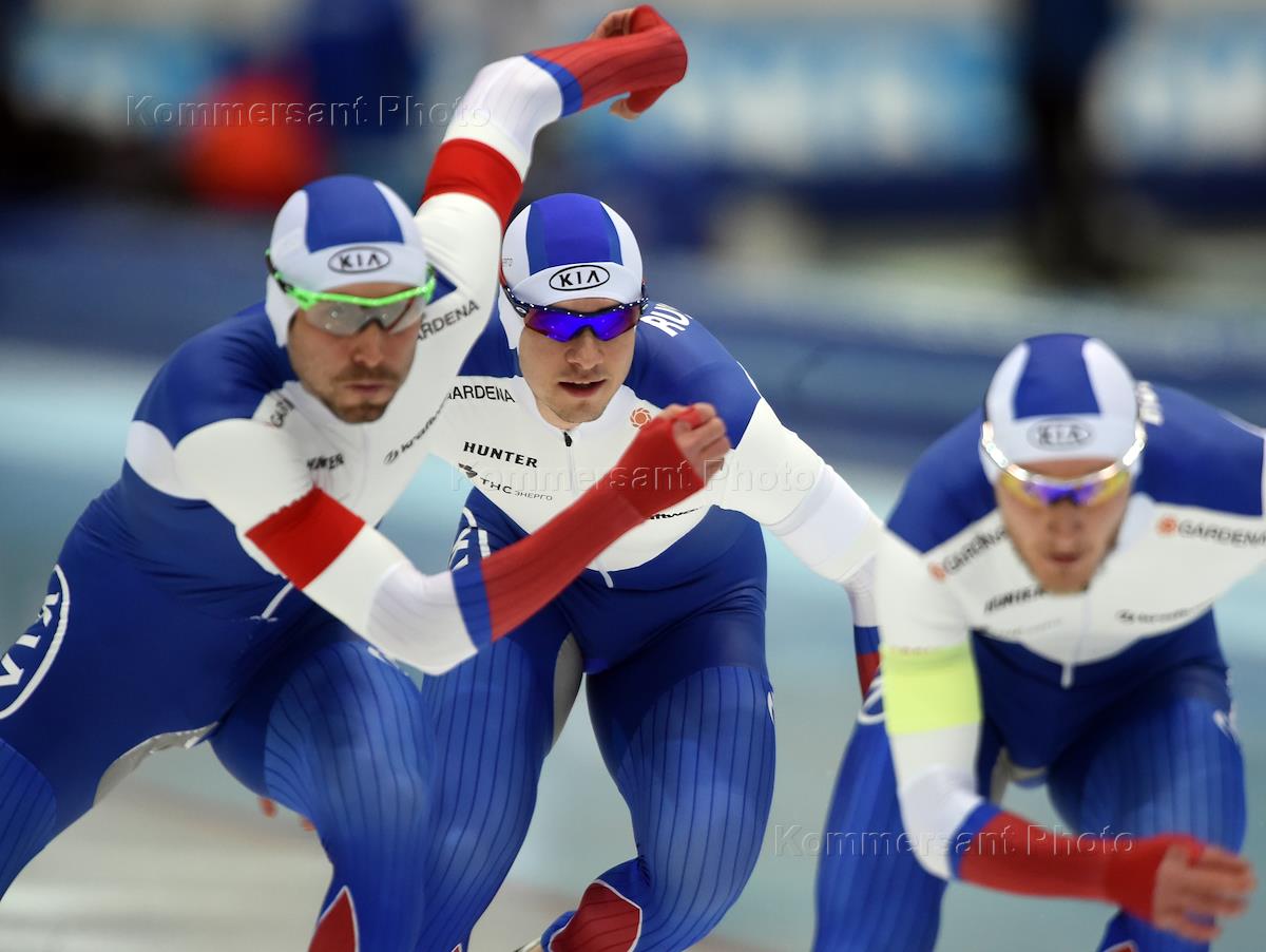 Чемпионат мира по конькобежному спорту 2016 в Коломне. Российский спортсмен Денис Юсков (в центре),…