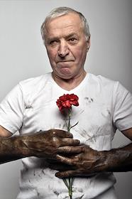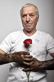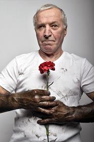 Обложка для журнала "Деньги". Мужчина в грязной майке держит грязными руками гвоздику.