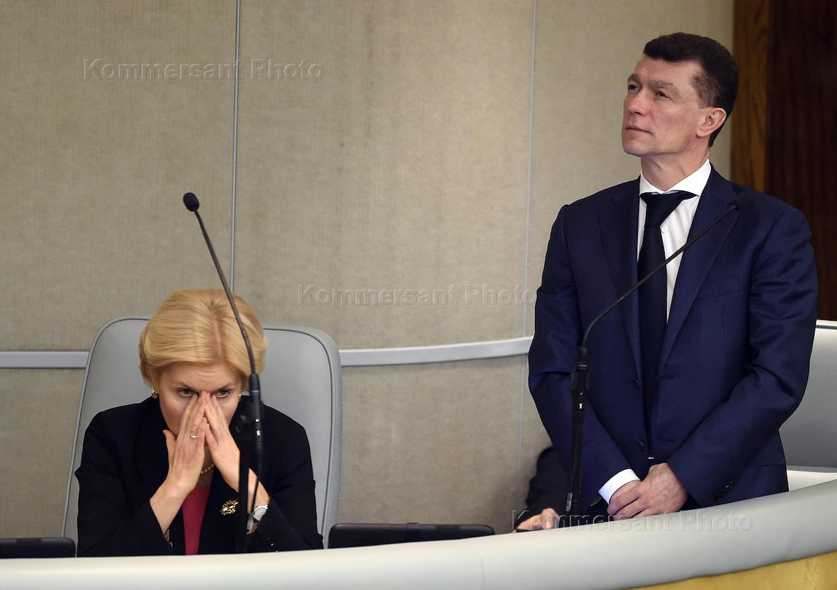 Пленарное заседание Государственной думы России. Слева направо: министр здравоохранения России…