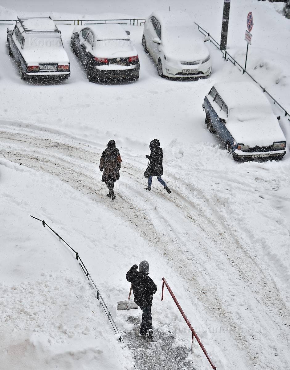 Виды Москвы после снегопада. Уборка снега на автомобильной парковке.