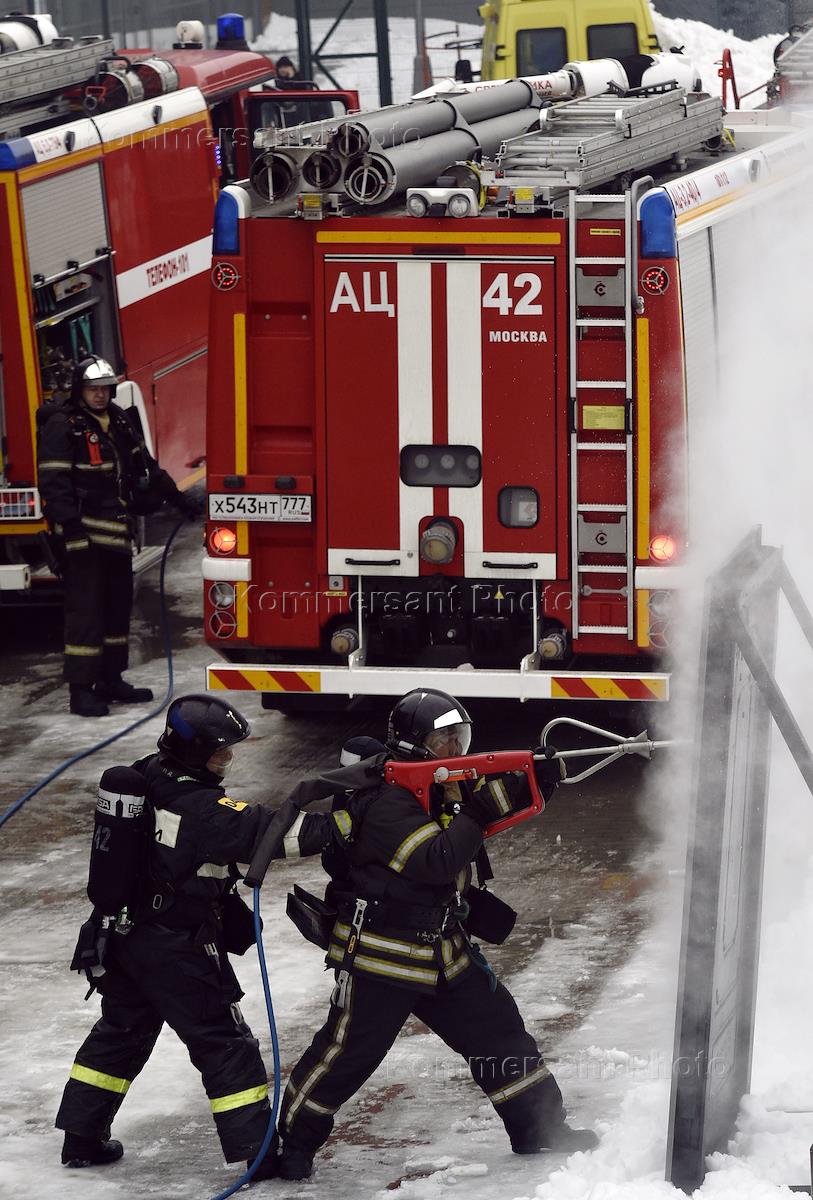 Сотрудники МЧС во время учений на территории многофункционального миграционного центра в деревне…