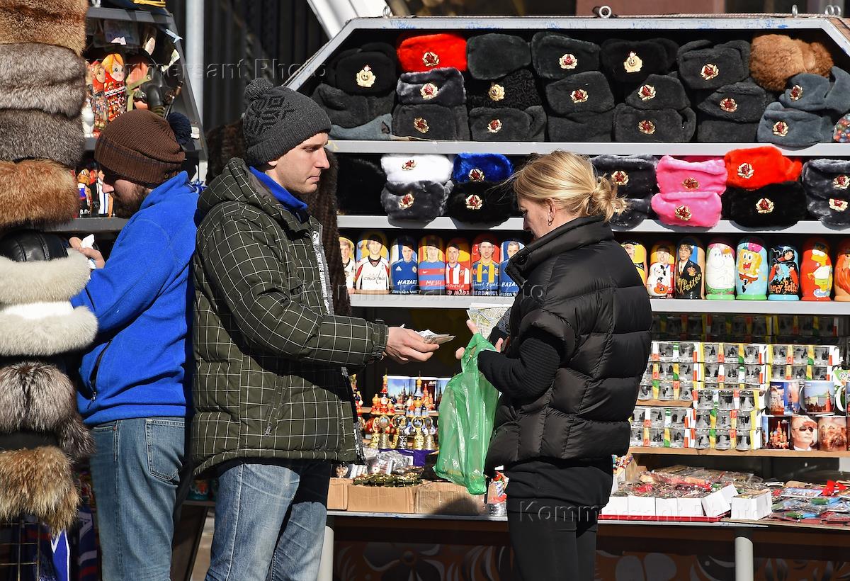 Виды Москвы. Красная площадь, Спасская башня Кремля. Витрина ГУМа.