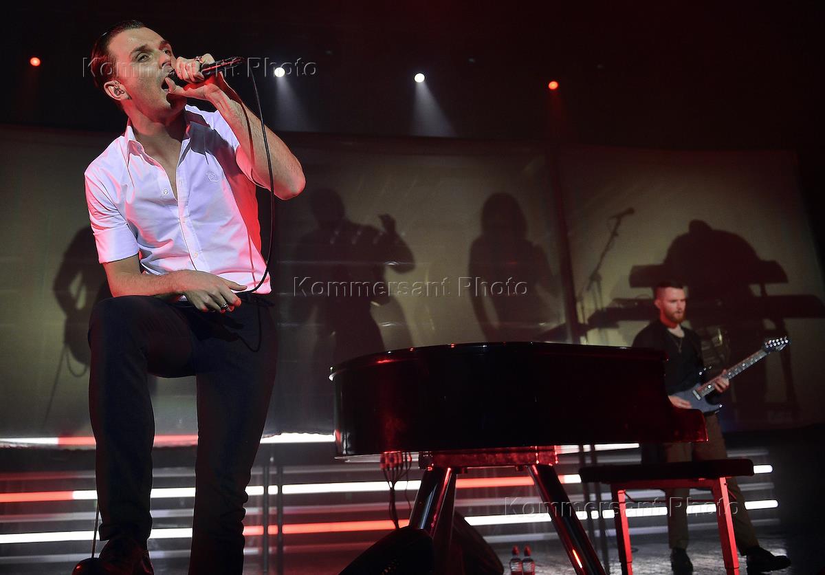 Солист британской группы Hurts Тео Хатчкрафт во время выступлние группы на концерте в Crocus City…