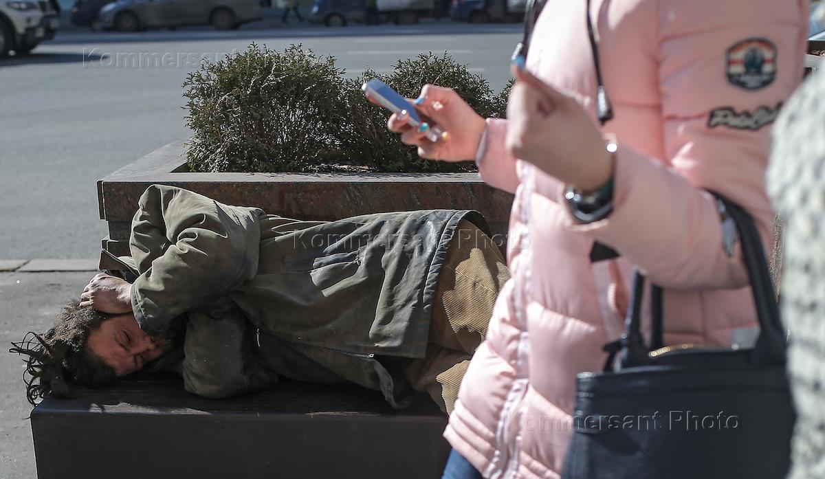 Жанровая фотография. Бомж спит на скамейке на Тверской улице.