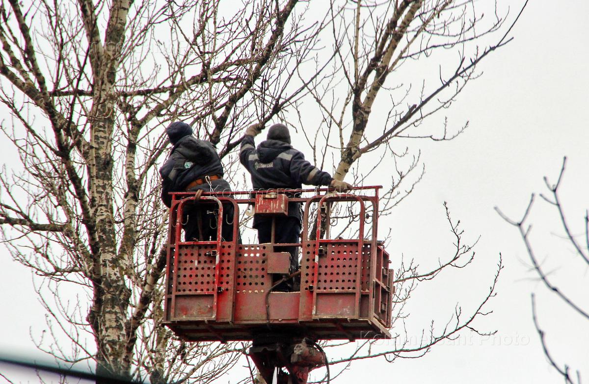 Жанровая фотография. Сотрудники коммунальных служб города во время весенней обрезки деревьев.