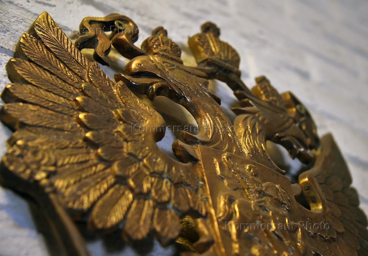 Жанровая фотография. Рука держит на стене позолоченный Герб России.