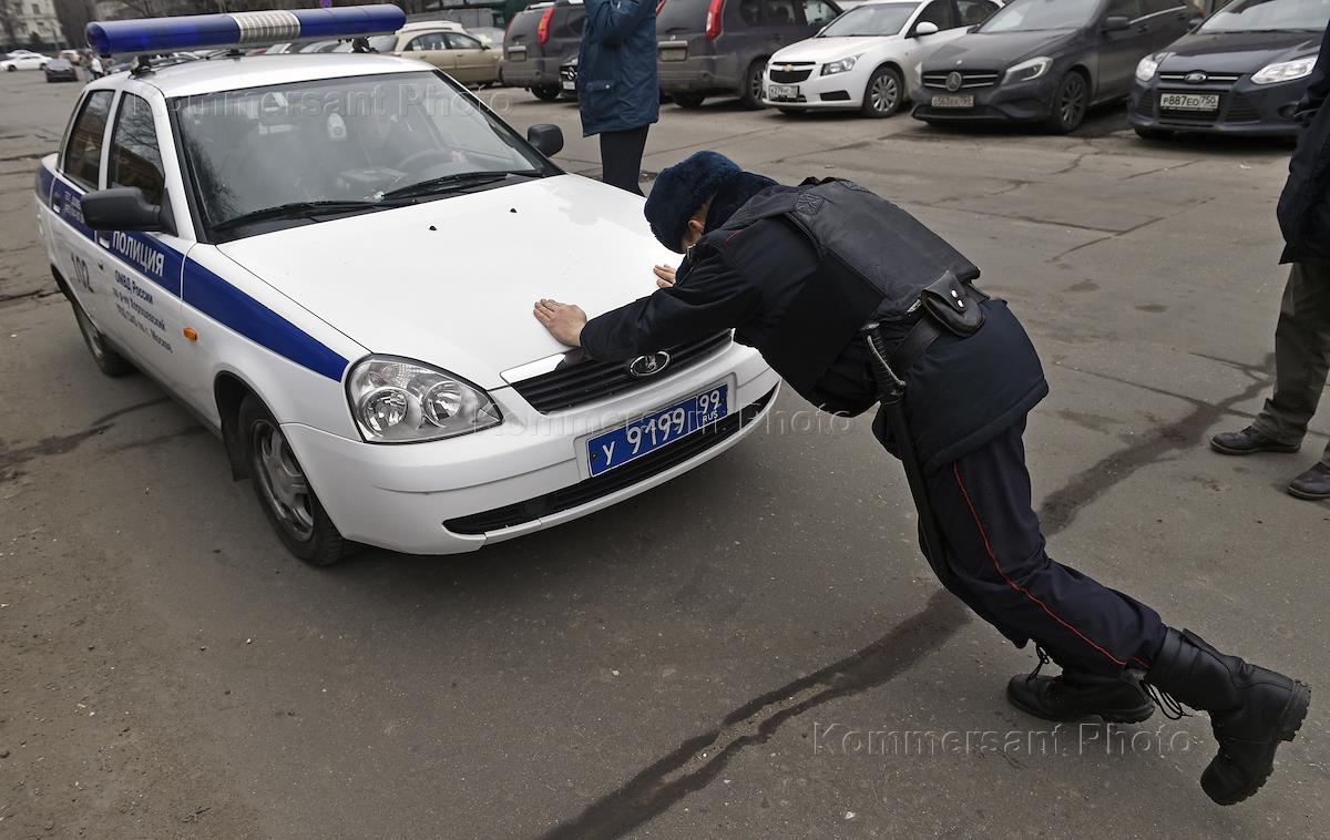 Жанровая фотография. Сотрудник полиции толкает автомобиль патрульно-постовой службы.