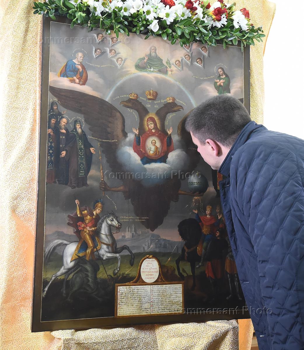 Мужчина прикладывается к иконе во время праздничных мероприятий в честь второй годовщины…