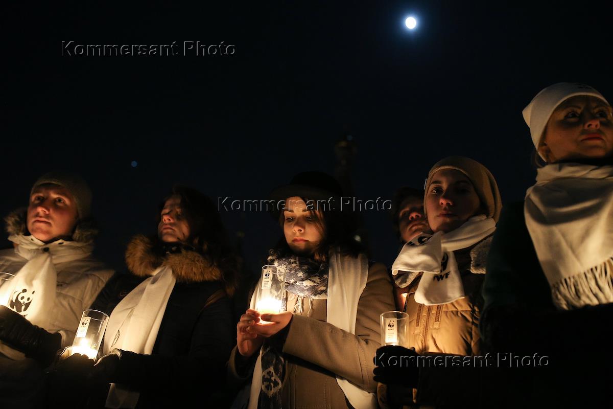 Поведение экологической акции "Час Земли" на Красной площади в Москве. Активисты Всемирного фонда…