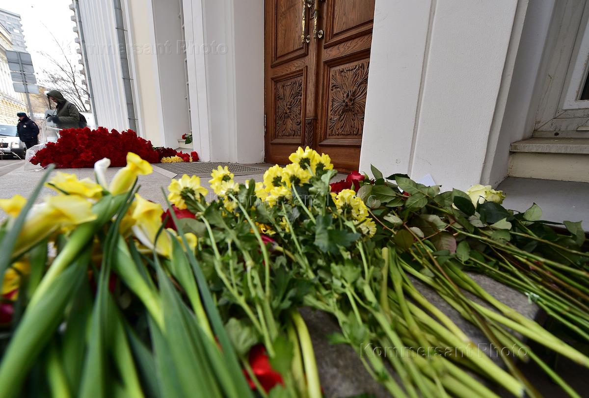 Цветы у здания Посольства Бельгии в Москве в память о погибщих в аэропорту Брюсселя 22 марта 2016…