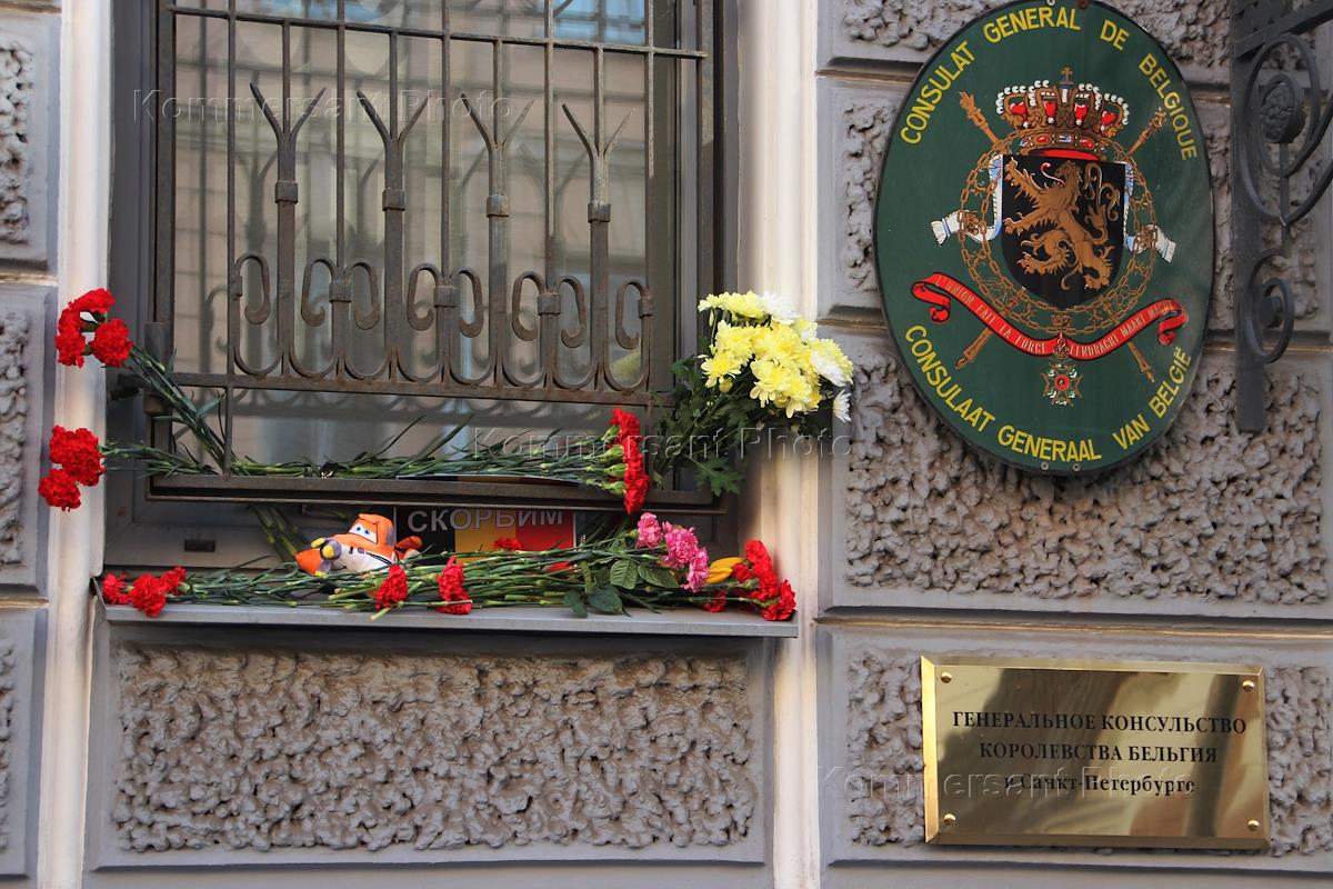 Цветы у консульства Бельгии, принесённые петербуржцами в память о погибших в результате взрывов, 22…