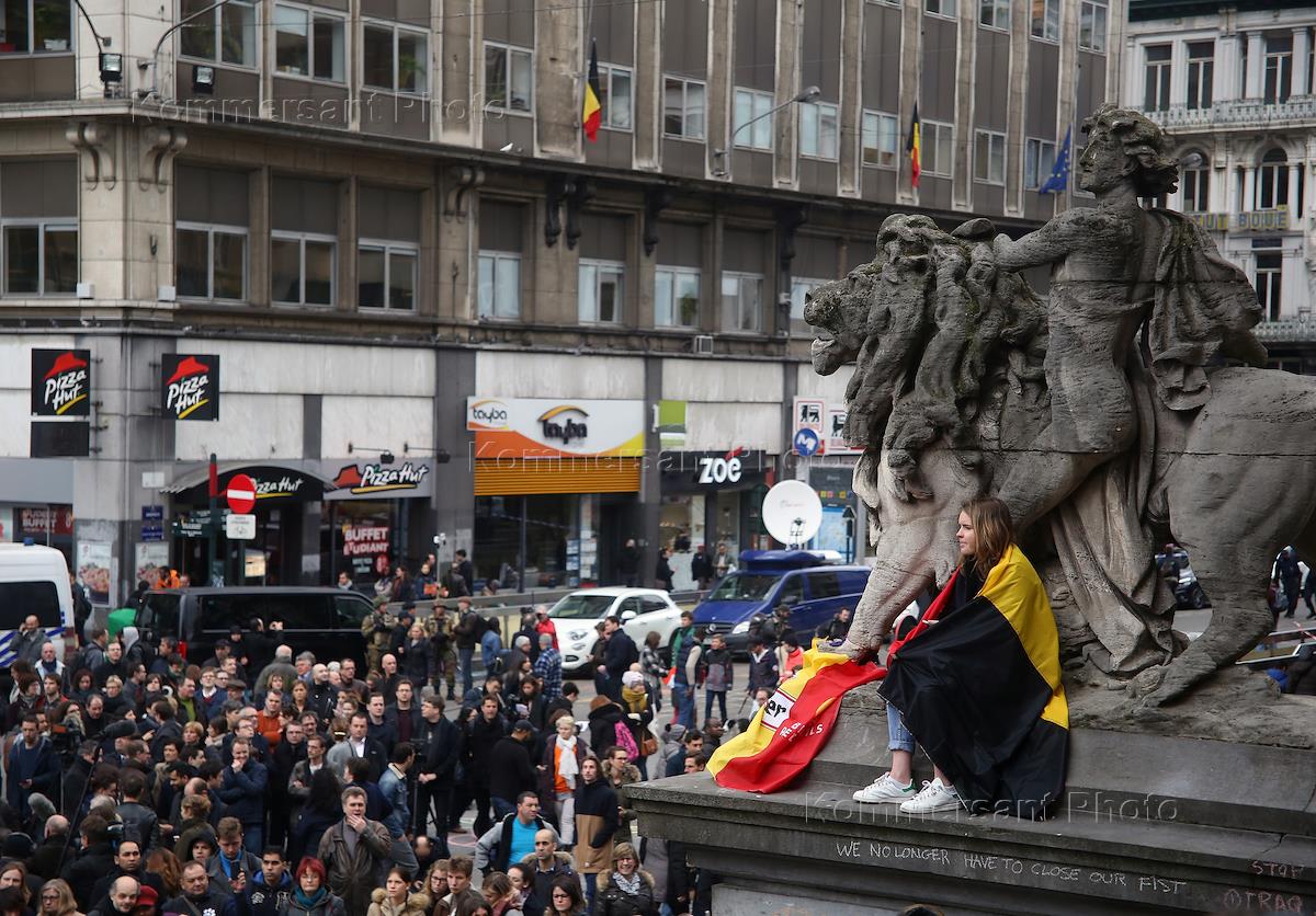 Последствия терактов в Брюсселе. Акция в память о погибщих 22 марта 2016 года, в аэропорту и в метро…