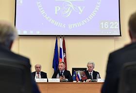 Наука Торжественное заседание Ученого совета совместно с Наблюдательным советом Гуманитарных чтений, приуроченное к 25-летию вуза. Торжественное заседание открывает Президент РГГУ, член-корреспондент РАН Ефим Пивовар в РГГУ.