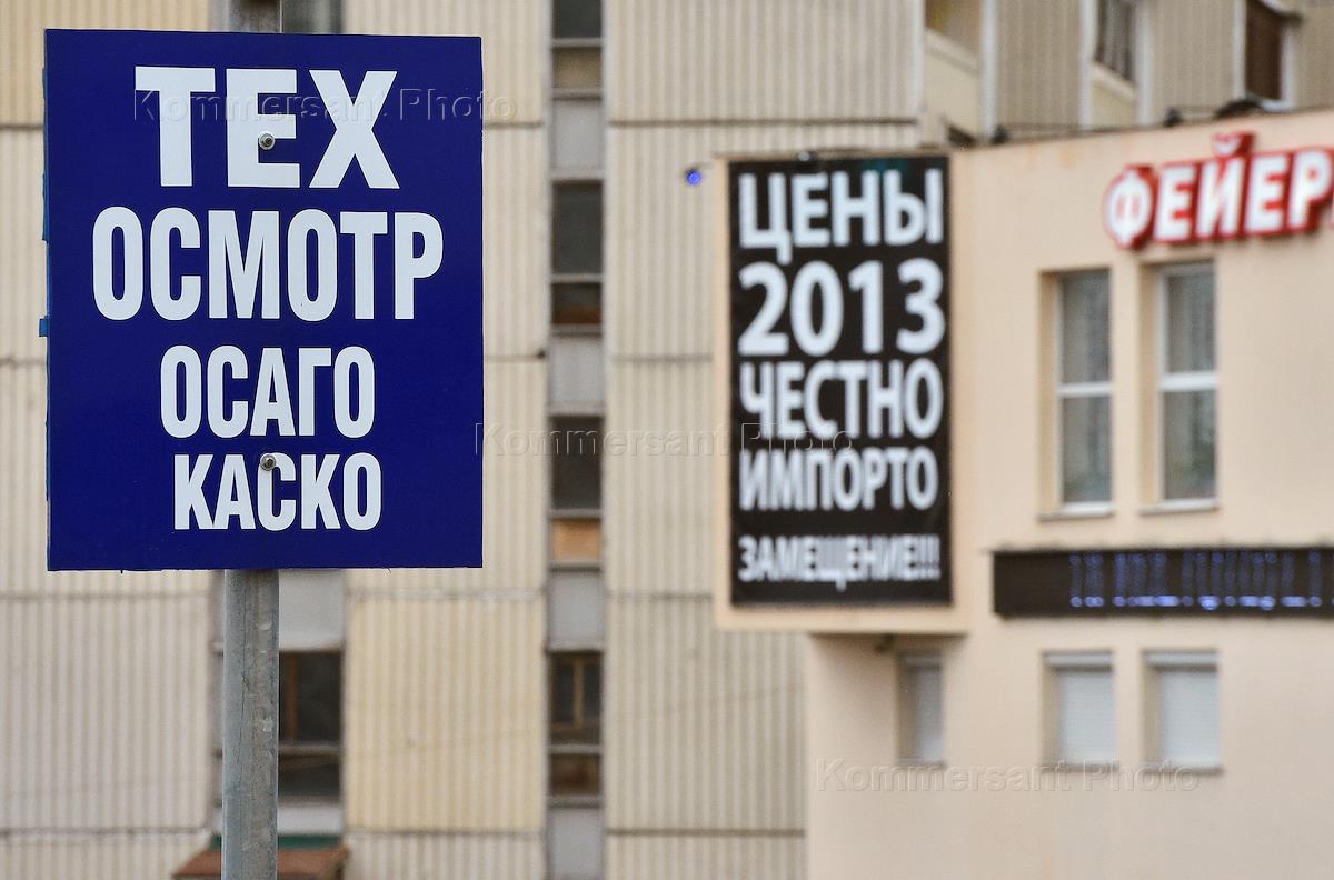 Жанровая фотография. Автомобили иностранных марок и плакат с надписью "Импортозамещение".