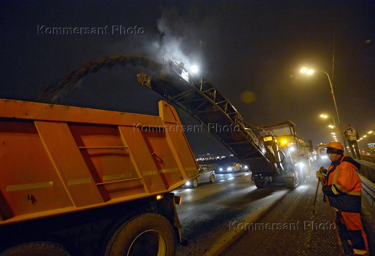 Жанровая фотография. Ремонт асфальтового покрытия на московской кольцевой автомобильной дороге…