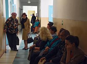 Жанровая фотография. Пожилая женщина просит милостыню у вывески с надписью "Кредит".