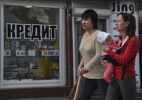 Жанровая фотография. Женщины с ребенком на руках идут по улице. Надпись на стекле "Кредит".