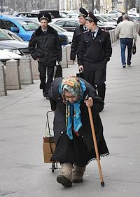 Жанровая фотография. Пожилая женщина с палочкой и полицейские идут по улице Охотный ряд.